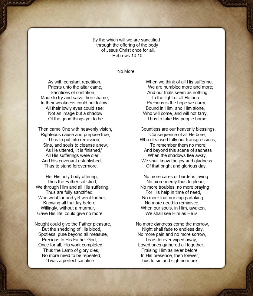 Hebrews chapter 10 (a) Poem by Kenneth I. Burnett Share this: Click to share on X (Opens in new window) X Click to share on Facebook (Opens in new window) Facebook Like Loading...