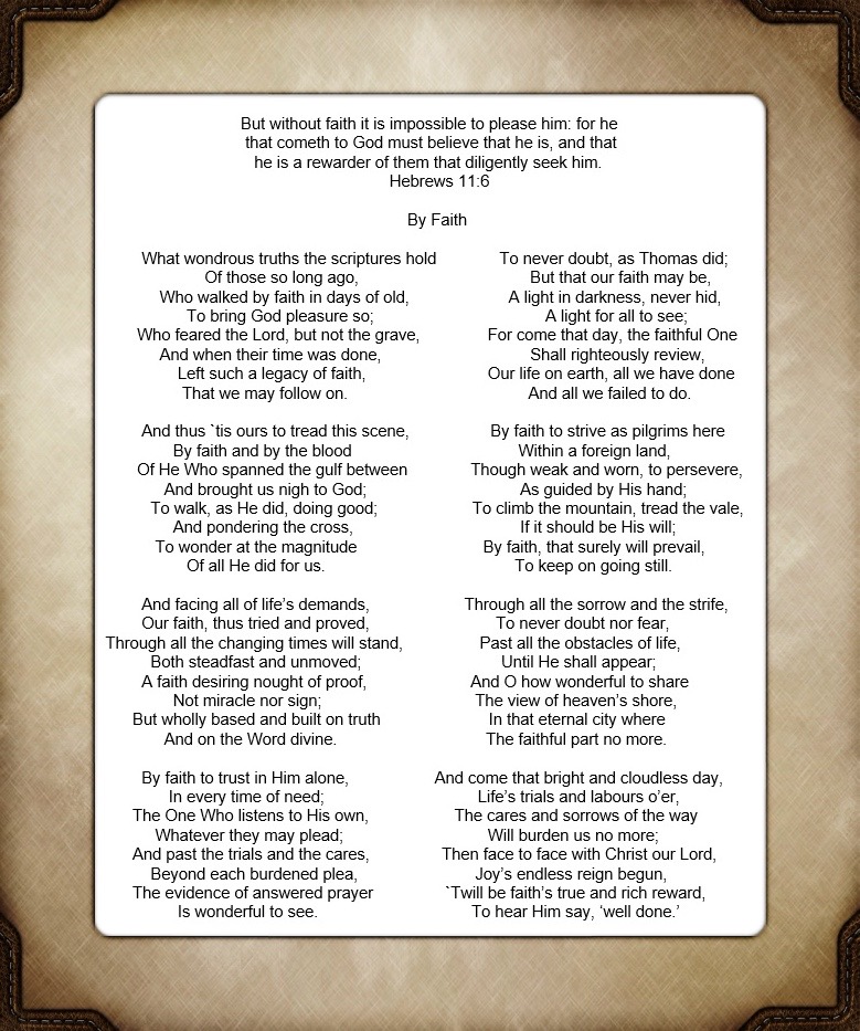 Hebrews chapter 11 (a) Poem by Kenneth I. Burnett Share this: Click to share on X (Opens in new window) X Click to share on Facebook (Opens in new window) Facebook Like Loading...