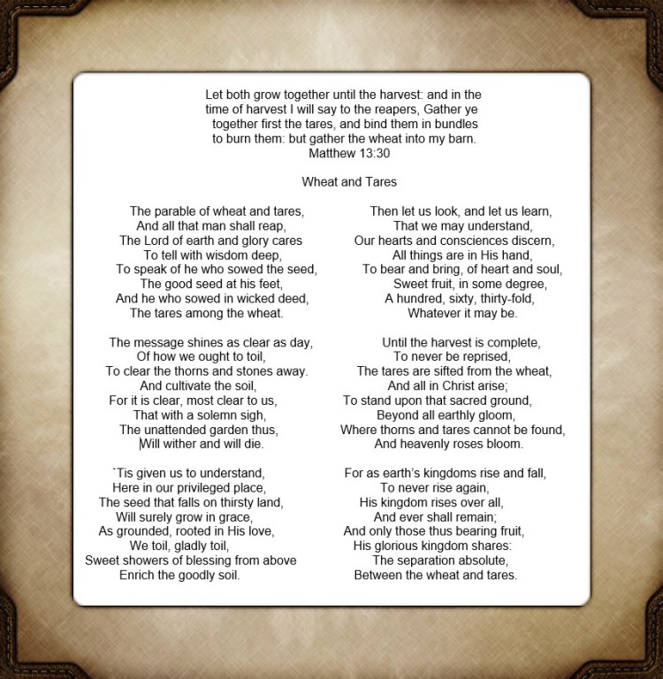 Matthew chapter 13 (b) Poem by Kenneth I. Burnett Share this: Click to share on X (Opens in new window) X Click to share on Facebook (Opens in new window) Facebook Like Loading...