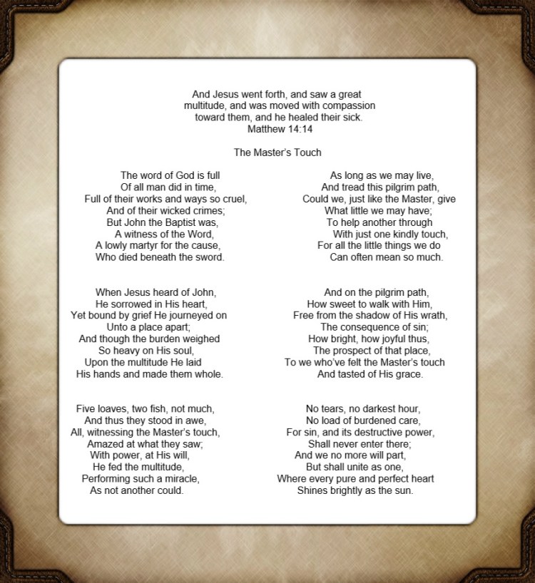Matthew chapter 14 (b) Poem by Kenneth I. Burnett Share this: Click to share on X (Opens in new window) X Click to share on Facebook (Opens in new window) Facebook Like Loading...