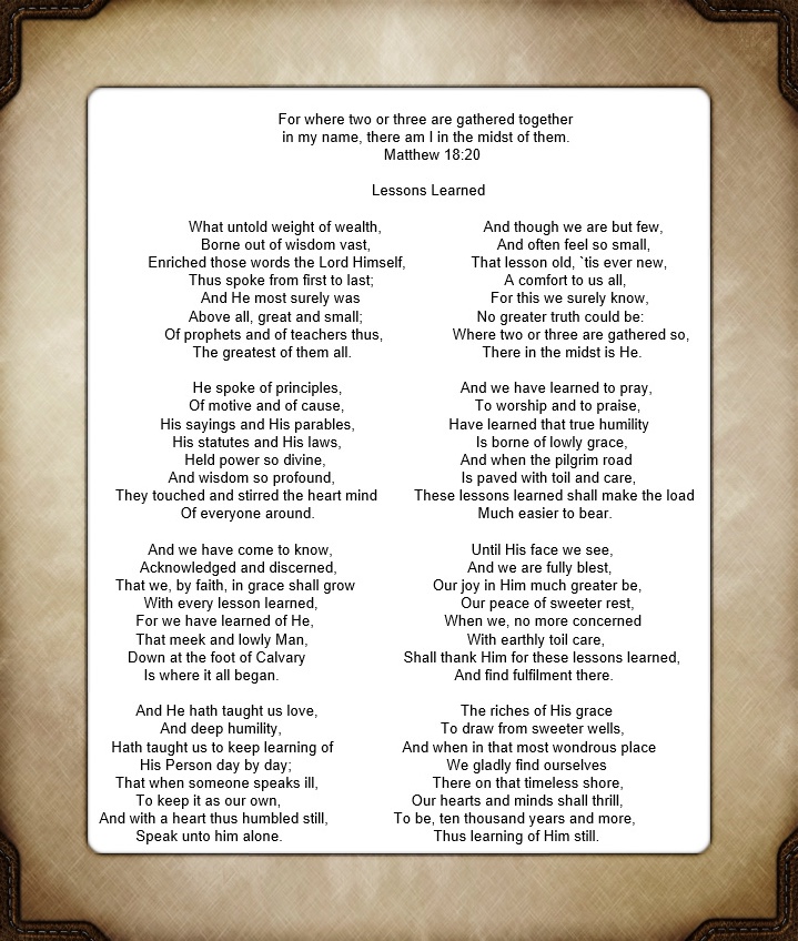 Matthew chapter 18 (b) Poem by Kenneth I. Burnett Share this: Click to share on X (Opens in new window) X Click to share on Facebook (Opens in new window) Facebook Like Loading...