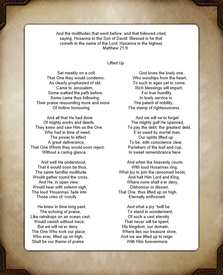 Matthew chapter 21 (a) Poem by Kenneth I. Burnett Share this: Click to share on X (Opens in new window) X Click to share on Facebook (Opens in new window) Facebook Like Loading...