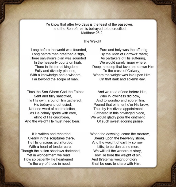 Matthew chapter 26 (a) Poem by Kenneth I. Burnett Share this: Click to share on X (Opens in new window) X Click to share on Facebook (Opens in new window) Facebook Like Loading...