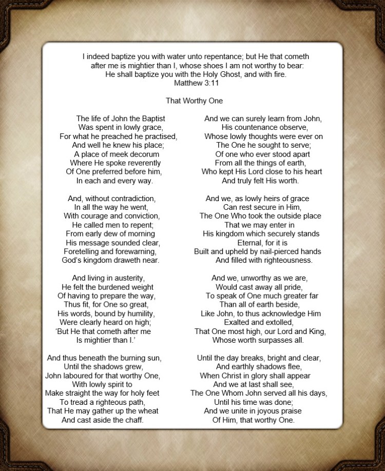 Matthew chapter 3 (a) Poem by Kenneth I. Burnett Share this: Click to share on X (Opens in new window) X Click to share on Facebook (Opens in new window) Facebook Like Loading...