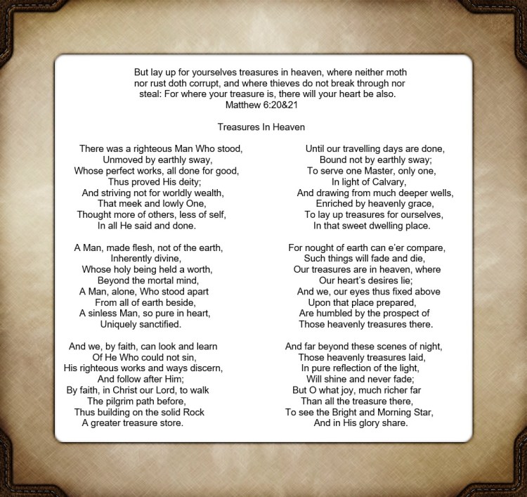 Matthew chapter 6 (b) Poem by Kenneth I. Burnett Share this: Click to share on X (Opens in new window) X Click to share on Facebook (Opens in new window) Facebook Like Loading...