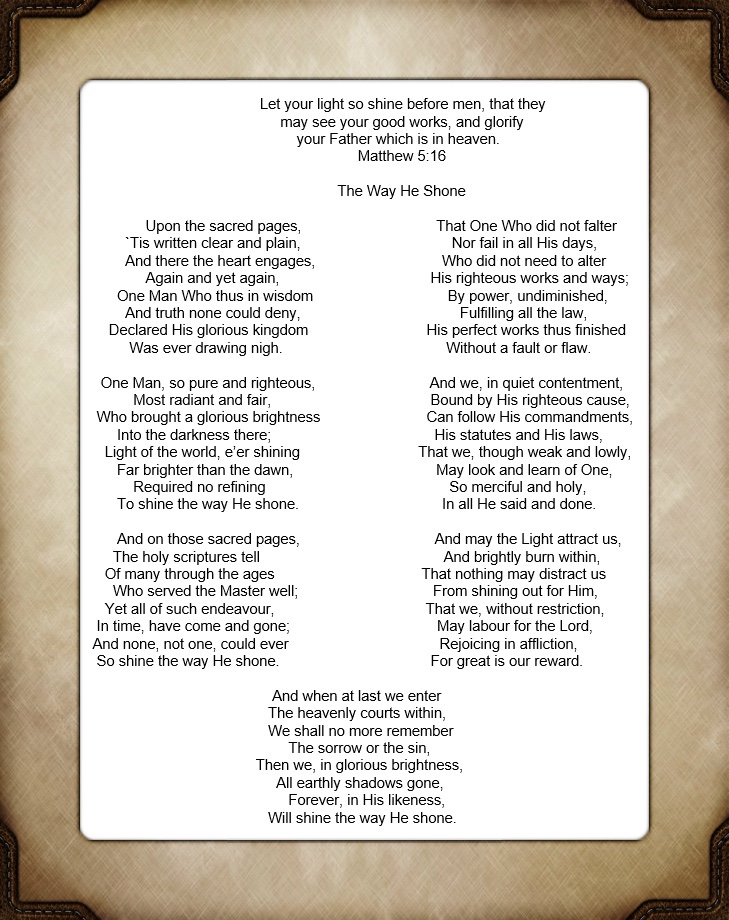 Matthew chapter 5 (c) Poem by Kenneth I. Burnett Share this: Click to share on X (Opens in new window) X Click to share on Facebook (Opens in new window) Facebook Like Loading...
