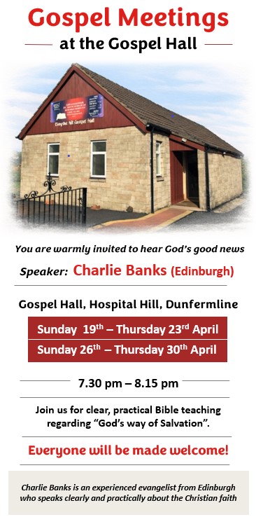 Venue: Gospel Hall, 24 Hospital Hill, Dunfermline, KY11 4AT.